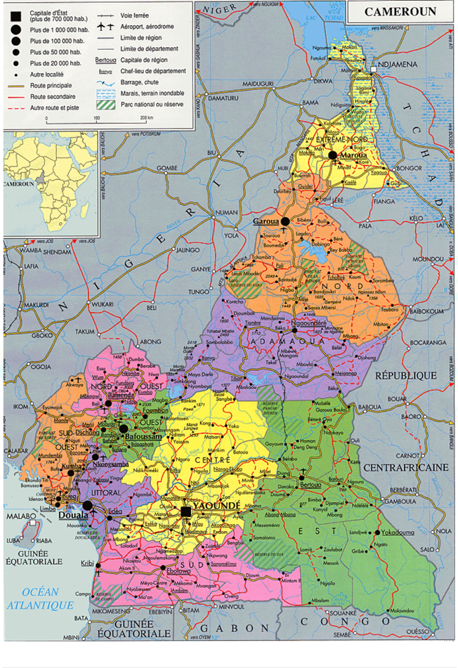 Le pays est découpé en dix régions et quatre grandes aires culturelles. Le tourisme y est varié, allant du safari au balnéaire. Le Cameroun est une république présidentielle avec une Assemblée nationale et un Sénat.